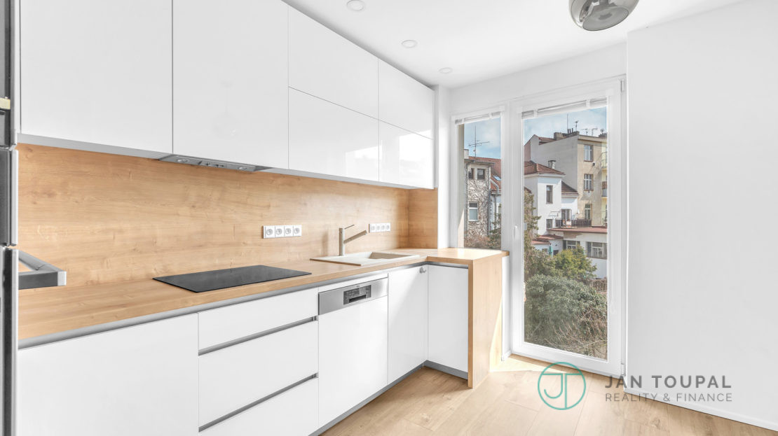 Byt se nabízí se zařízenou kuchyňskou linkou, včetně spotřebičů a prostorným gaučem v obývacím pokoji.